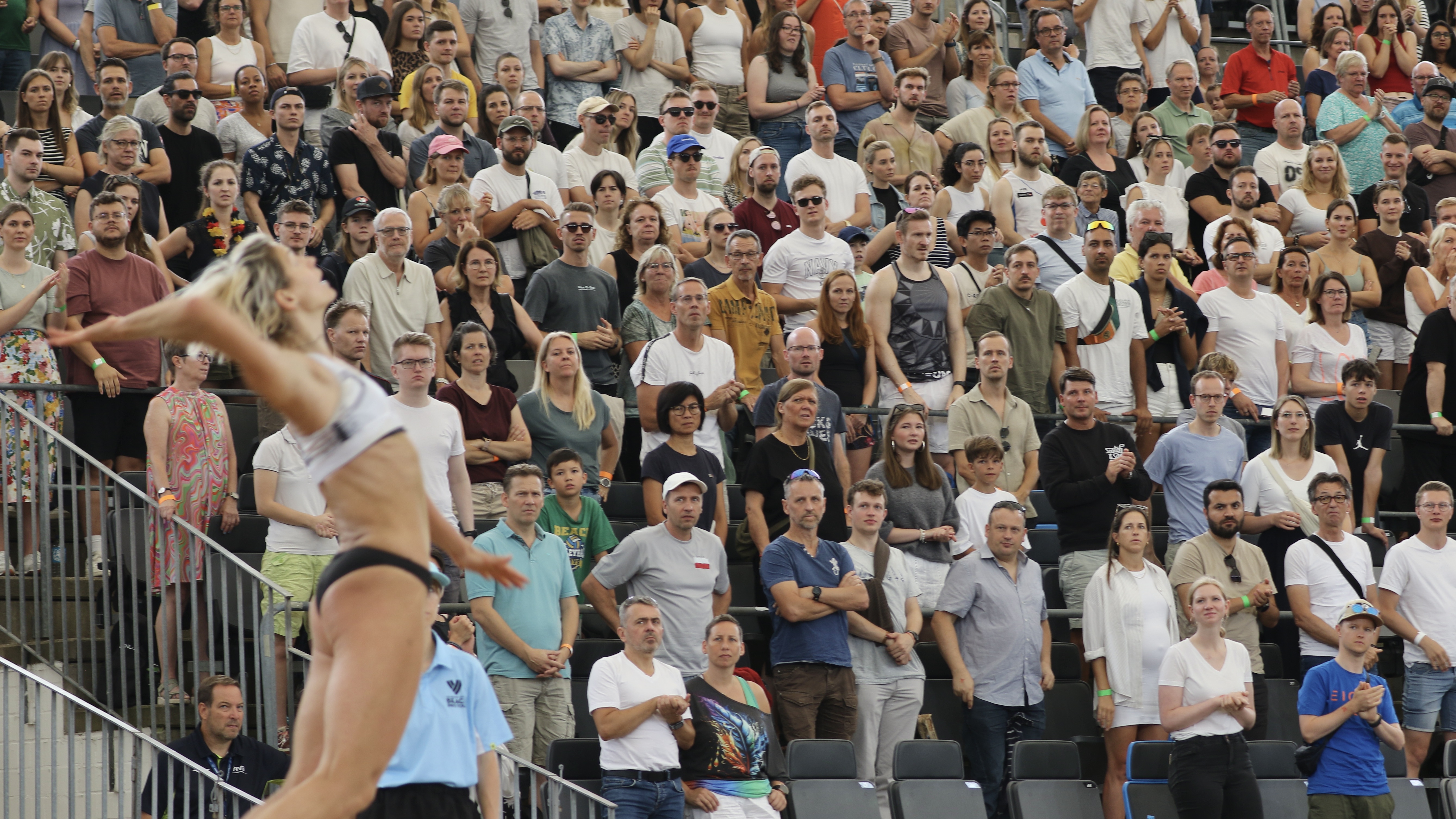 After serving on the next point, Dani denied Canada a quick answer with a pokey dig, then hammered the ball through the opponent for the point and the lead. This time, Tania exploded with two fist pumps, pointing at her partner with her other hand, and a chest bump. Walking back to serve again, Dani couldn’t suppress a grin.